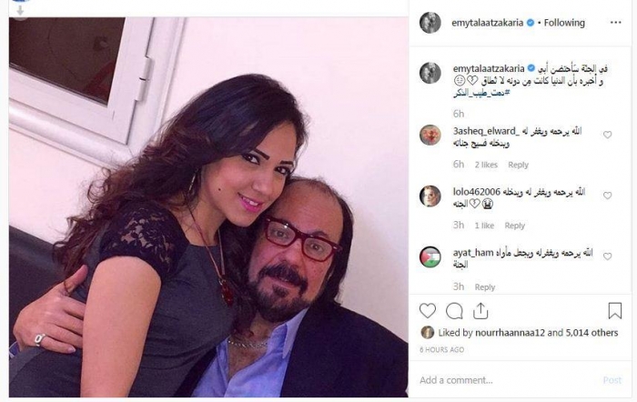 ونشرت إيمي، صورة تجمعها معه، قائلة: "في الجنّة.. سَأحتضن أبي وأُخبره بأن الدنيا كانت مِن دونه لا تُطاق، دمت طيب الذكر".