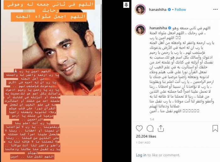 ونشرت هنا صورة للراحل هيثم، عبر حسابها بموقع "إنستجرام"، وعلقت: "اللهم في ثاني جمعه وهو في رحابك، اللهم اجعل مثواه الجنة، اللهم أمين يا رب، يا رب ارحمه واغفر له واجعله من أهل الجنة، يا رب إن له اأبه في الأرض يدعونك فاستجب لهم".