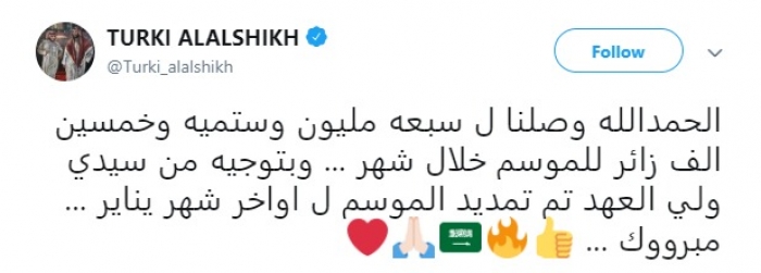 وأعلن رئيس هيئة الترفيه السعودية، تمديد فترة موسم الرياض حتى آواخر يناير المقبل، ونشر صورة عبر حسابه الرسمي في "تويتر": "مددنا الموسم ومعكم حتى آواخر شهر يناير".