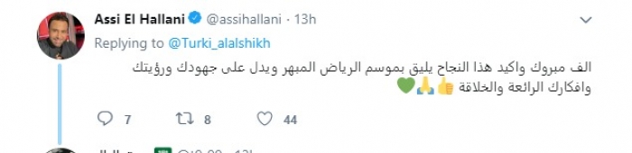 وكتب عاصي موجهًا حديثه لآل الشيخ: "ألف مبروك وأكيد هذا النجاح يليق بموسم الرياض المبهر ويدل على جهودك ورؤيتك وأفكارك الرائعة والخلاقة".