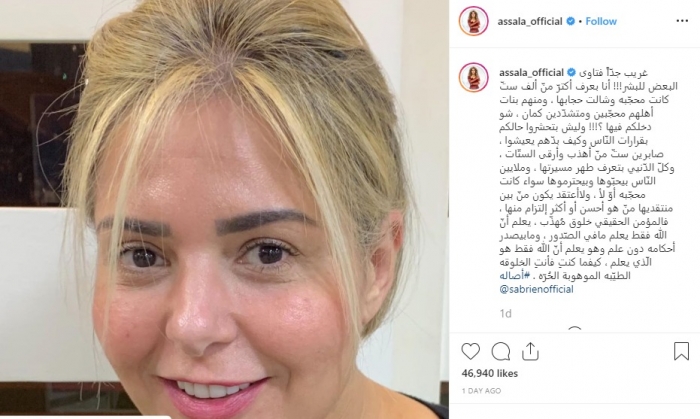 ونشرت أصالة صورة لصابرين، عبر حسابها الرسمي بموقع "إنستجرام"، وعلقت :" غريب جدّاً فتاوى البعض للبشر أنا بعرف أكترّ منّ ألف ستّ كانت محجّبة وشالت حجابها ، ومنهم بنات أهلهم محجّبين ومتشدّدين كمان ، شو دخلكم فيها، وليش بتحشروا حالكم بقرارات النّاس وكيف بدّهم يعيشوا ".
