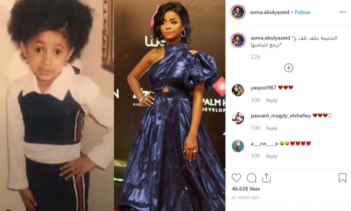 نشرت الفنانة الشابة أسماء أبواليزيد، عبر حسابها على"إنستجرام"، صورتها في مهرجان القاهرة السينمائي، إلى جانب صورة لطفولة الفنانة العالمية كاردي بي، التي تحولت فيما بعد لكوميك شهير على مواقع التواصل الاجتماعي، مشابه لوقفتها وتعبيرات وجهها.
