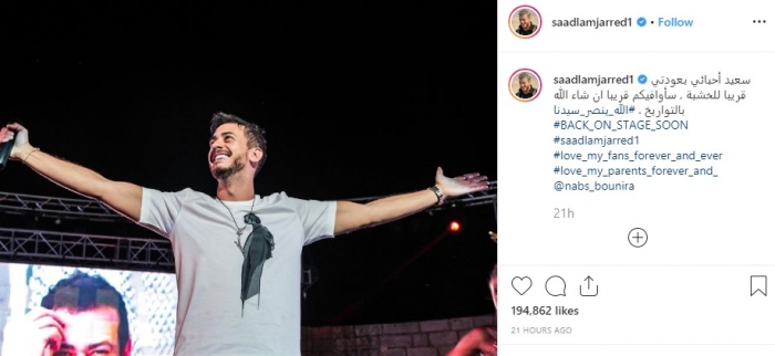 ونشر لمجرد صورة له أثناء وقوفه على المسرح بإحدى حفلاته، وعلق: "سعيد أحبائي بعودتي قريبًا للخشبة، سأوافيكم قريبا إن شاء الله بالتواريخ".
