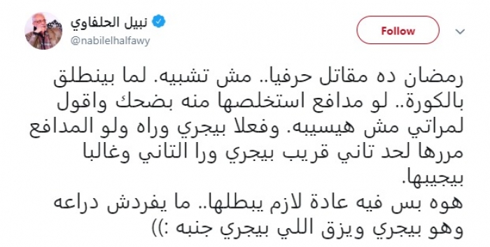 كما حرص "الحلفاوي"، على توجيه نصيجة للاعب، وذلك في تغريدة عبر حسابه على "تويتر"، وكتب الحلفاوي: "رمضان ده مقاتل حرفيا.. مش تشبيه. لما بينطلق بالكورة.. لو مدافع استخلصها منه بضحك وأقول لمراتي مش هيسيبه. وفعلا بيجري وراه ولو المدافع مررها لحد تاني قريب بيجري ورا التاني وغالبا بيجيبها".