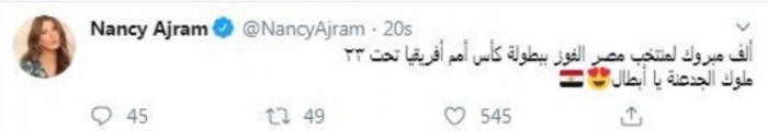 حرصت الفنانة اللبنانية نانسي عجرم، على تهنئة المنتخب المصري الأولمبي عقب فوزه ببطولة أمم أفريقيا بعد تغلبه على منتخب كوت ديفوار بنتيجة 2 - 1.