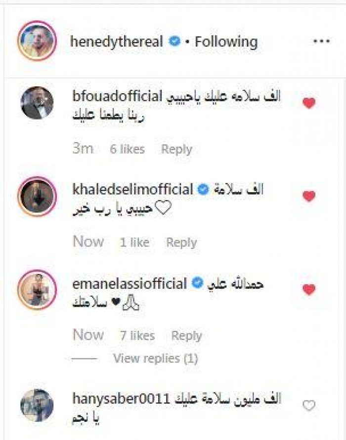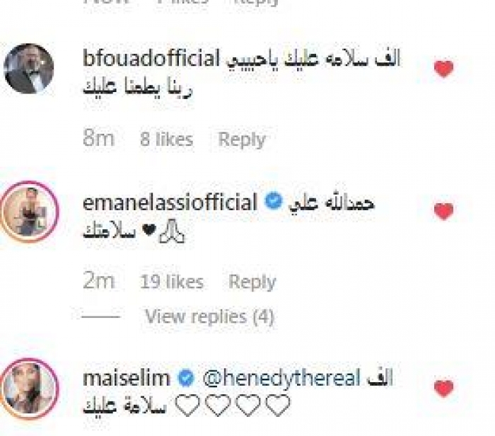 وعلقت الفنانة إيمان العاصي، عبر حسابها على"إنستجرام" قائلة: "حمد الله على سلامتك".