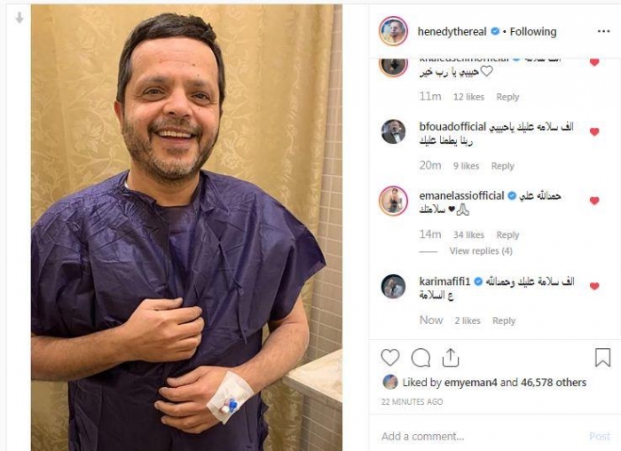وتفاعل عدد كبير من نجوم الفن مع إعلان هنيدي، عقب خروجه من العملية، فحرص الفنان خالد سليم على دعم هنيدي، وعلق على"إنستجرام"، قائلاً: "ألف سلامة حبيبي.. يا رب خير".