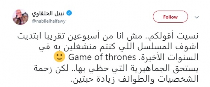 وأضاف: "Game of thrones، يستحق الجماهيرية التي حظي بها.. لكن زحمة الشخصيات والطوائف زيادة حبتين".
