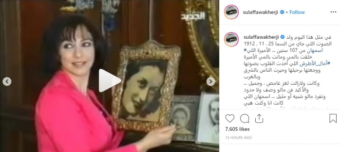 وكتبت سلاف: "في مثل هذا اليوم ولد الصوت اللي جاي من السما 25 . 11 . 1912، أسمهان من 107 سنة، الأميرة اللي خلقت بالمي وماتت بالمي، الأميرة آمال الأطرش اللي أخدت القلوب بصوتها ووجعتها برحيلها وحيرت الناس بالشرق وبالغرب، وكانت ولازالت لغز غامض، وجميل ... والأكيد فن مالو وصف ولا حدود وتفرد مالو شبيه أو مثيل".