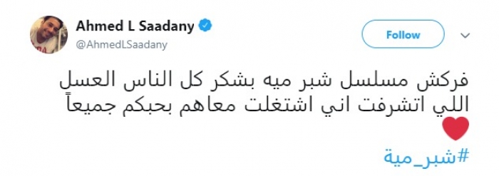 نشر الفنان أحمد صلاح السعدني، عبر حسابه الشخصي بموقع "تويتر" تغريدة، أعلن بها انتهاء تصوير مسلسل "شبر ميه".