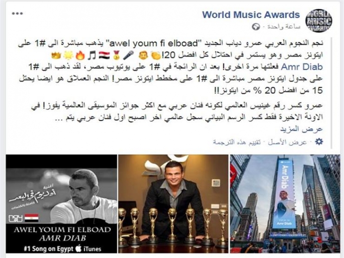 ورلد ميوزيك أوورد تهنئ عمرو دياب لتصدره تطبيق I tunes
