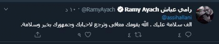 وكتب رامي عياش: "ألف سلامة عليك.. الله يقومك معافى وترجع لأحبابك وجمهورك بخير وسلامة".