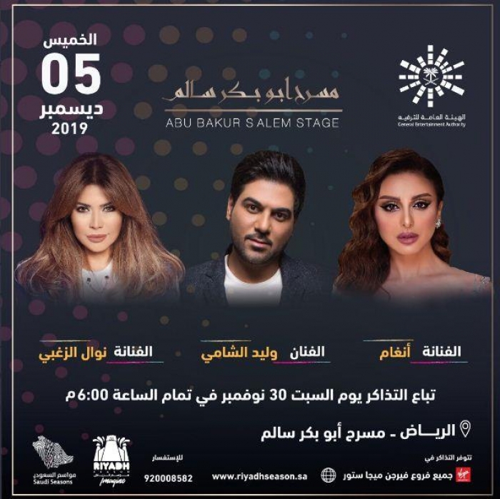 ويشارك أنغام الغناء، المطربة اللبنانية نوال الزغبي، والمطرب العراقي وليد الشامي، وتباع التذاكر ابتداء من السبت الموافق 30 نوفمبر.