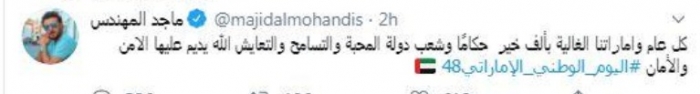 حرص المطرب العراقي ماجد المهندس، على تهنئة الإمارات باليوم الوطني الـ48.