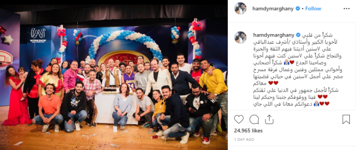 وتابع الميرغني: "شكراً أصحابي وأخواتي ممثلين وفنين وعمال فرقة مسرح مصر على أجمل ٧سنين في حياتي قضيتها معاكم، شكراً لأجمل جمهور في الدنيا علي ثقتكم فينا ووقوفكم جنبنا وحبكم لينا، دعواتكم معانا في اللي جاي".