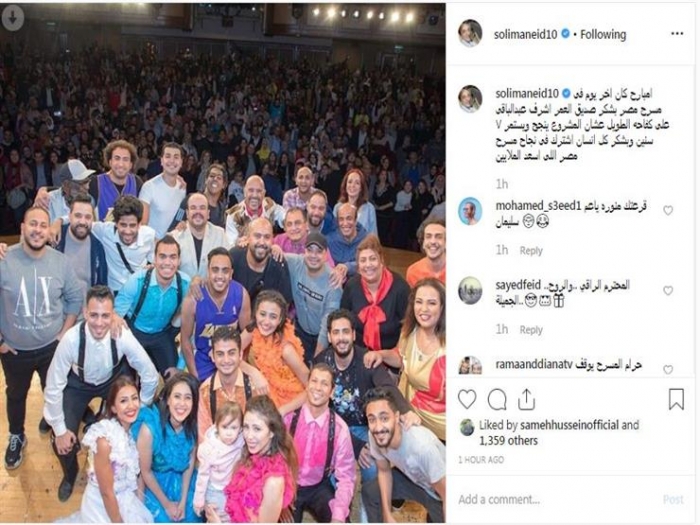 ونشر سليمان صورة له مع الفريق عبر حسابه الرسمي على موقع "إنستجرام"، وعلق: "إمبارح كان آخر يوم فى مسرح مصر.. بشكر صديق العمر أشرف عبدالباقى على كفاحه الطويل عشان المشروع ينجح ويستمر ٧ سنين، وبشكر كل إنسان اشترك في نجاح مسرح مصر اللي أسعد الملايين".