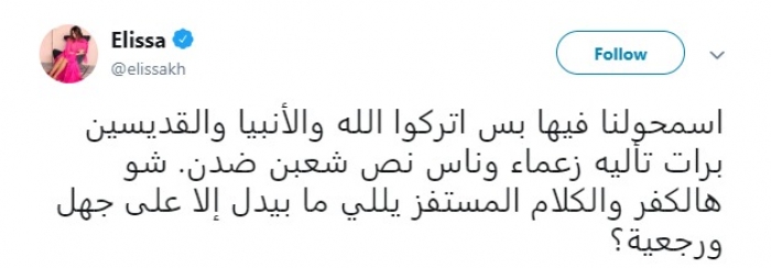 وكتبت إليسا: "اسمحولنا فيها بس اتركوا الله والأنبيا والقديسين برات تأليه زعماء وناس نص شعبن ضدن، شو هالكفر والكلام المستفز يللي ما بيدل إلا على جهل ورجعية؟".
