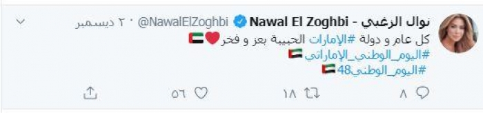 وعلقت الفنان اللبنانية نوال الزغبي، عبر حسابها الرسمي بموقع تويتر: "كل عام ودولة الإمارات الحبيبة بعز وفخر، اليوم الوطني الإماراتي الـ 48".