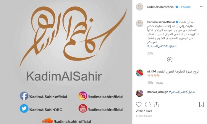 ونشر الساهر بوستر حفله، عبر حسابه الرسمي بموقع "إنستجرام"، وعلق: " نود أن نلفت عنايتكم إلى أن تم إلغاء مشاركة كاظم الساهر في مهرجان موسم الرياض نظراً للظروف الراهنة في العراق الحبيب، نعتذر من الجمهور السعودي الكريم و نشكركم لتفهمكم".