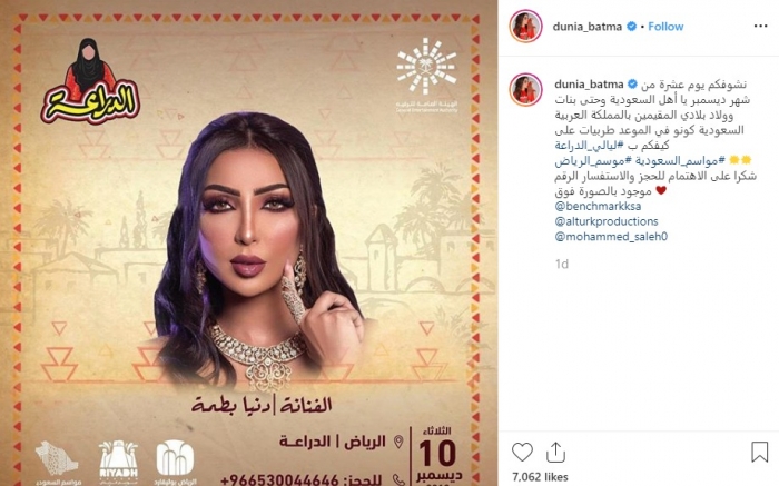 ونشرت دنيا بوستر دعائي للحفل، عبر حسابها الرسمي بموقع "انستجرام"، وعلقت: "نشوفكم يوم عشرة من شهر ديسمبر يا أهل السعودية، وحتى بنات وولاد بلادي المقيمين بالمملكة العربية السعودية، كونوا في الموعد طربيات على كيفكم بليالي الدرعية".