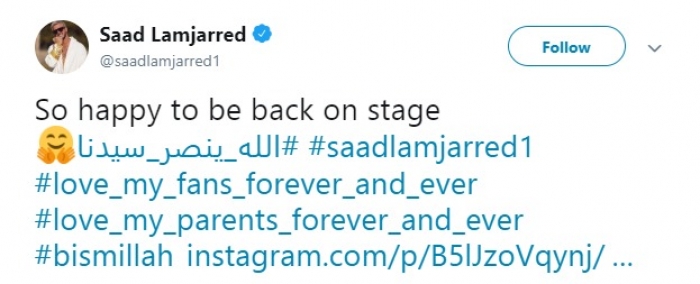 عبر المطرب المغربي سعد لمجرد عن سعادته، بعودته لإحياء حفلات غنائية بعد غياب ما يزيد عن ثلاثة سنوات.
