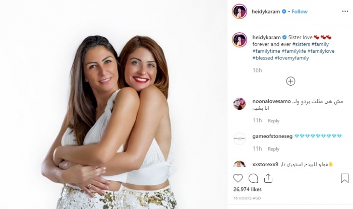 نشرت الفنانة هيدي كرم، عبر حسابها الرسمي بموقع إنستجرام، صورة تجمعها بشقيقتها مايان كرم.