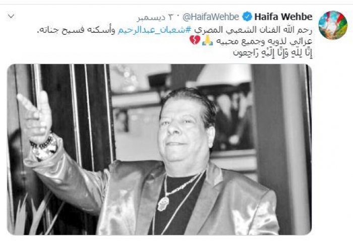 ونشرت "هيفاء" عبر حسابها الرسمي بموقع تويتر، صورة للفنان الراحل، وعلقت: "رحم الله الفنان الشعبي المصري شعبان عبدالرحيم وأسكنه فسيح جناته، عزائي لذويه وجميع محبيه، إنا لله وإنا إليه راجعون".