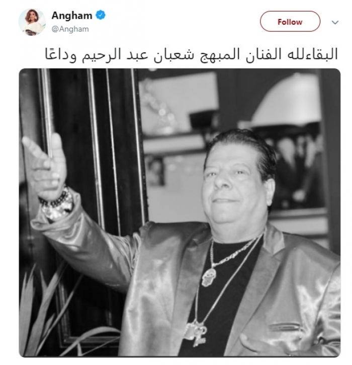 ونشرت أنغام صورة للراحل شعبان عبدالرحيم، عبر حسابها بموقع "تويتر"، وعلقت: "البقاء لله.. المبهج شعبان عبدالرحيم".