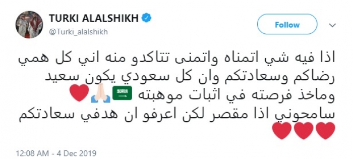 وودع "آل الشيخ" الجميع برسالة مؤثرة قبل بدء رحلة العلاج، وكتب عبر حسابه على "تويتر" :« إذا فيه شيء أتمناه وأتمنى تتأكدوا منه أني كل همي رضاكم وسعادتكم وأن كل سعودي يكون سعيداً وماخذ فرصته في إثبات موهبته».