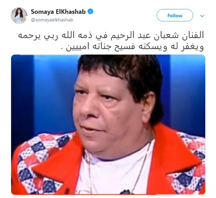 نعت الفنانة سمية الخشاب، عبر حسابها الرسمي بموقع تويتر، المطرب الشعبي شعبان عبدالرحيم، الذي رحل عن عالمنا أمس الثلاثاء.