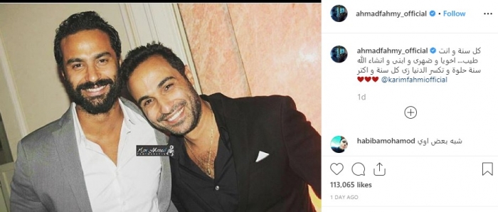ونشر "فهمي" صورة تجمعه بشقيقه، عبر حسابه الرسمي بموقع إنستجرام، وعلق: "كل سنة وإنت طيب، أخويا وضهري وابني وإن شاء الله سنة حلوة وتكسر الدنيا زي كل سنة أكتر".