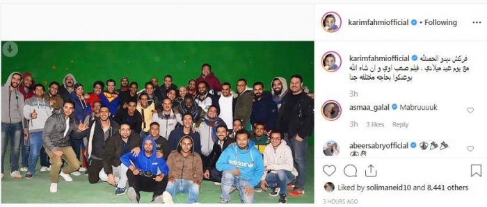 ونشر كريم، صورة من كواليس آخر يوم تصوير بالفيلم، عبر حسابه على "إنستجرام"، وعلق: "فركش ديدو..الحمد لله مع يوم عيد ميلادي.. فيلم صعب أوي، وإن شاء الله، بوعدكم بحاجة مختلفة جدا".