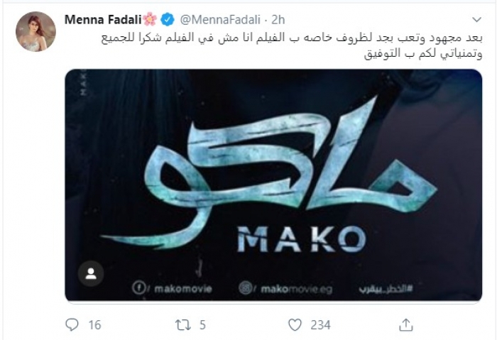 وكتبت منة فضالى، عبر حسابها على تويتر، "بعد مجهود وتعب بجد لظروف خاصة بالفيلم أنا مش فى الفيلم شكرا للجميع وتمنياتى لكم بالتوفيق".