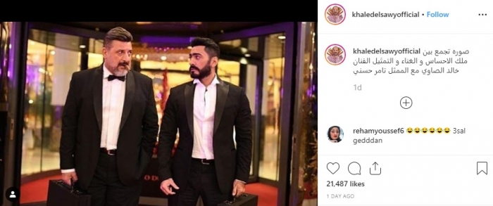 وكتب الصاوي ممازحًا جمهوره: "صورة تجمع بين ملك الإحساس والغناء والتمثيل الفنان خالد الصاوي مع الممثل تامر حسني".