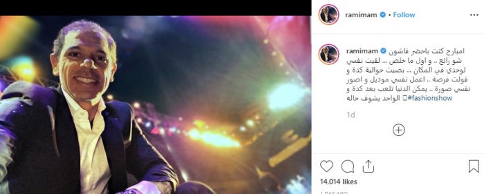 كتب رامي ساخرًا: "إمبارح كنت بحضر فاشون شو رائع، وأول ما خلص لقيت نفسي لوحدي في المكان، بصيت حواليا كده وقلت فرصة أعمل نفسي موديل وأصور نفسي صورة، يمكن الدنيا تلعب بعد كده والواحد يشوف حاله".