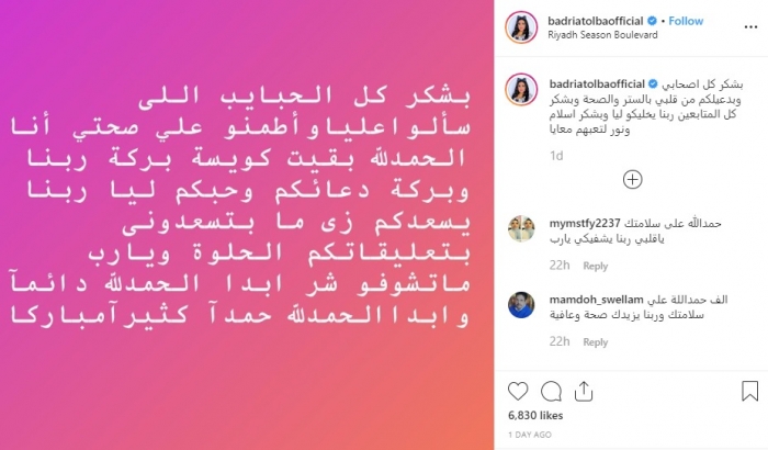 وكتبت بدرية طلبة عبر حسابها بـ"إنستجرام": "بشكر كل الحبايب اللي سألوا عليا واطمنو على صحتي أنا لحمد الله بقيت كويسة ببركة ربنا وبركة دعائكم وحبكم ليا ربنا يسعدكم زي ما بتسعدوني بتعليقاتكم الحلوة ويارب ما تشوفو شر ابدا الحمد الله دائما وابدا الحمد الله حمدا كثيرا مباركا".
