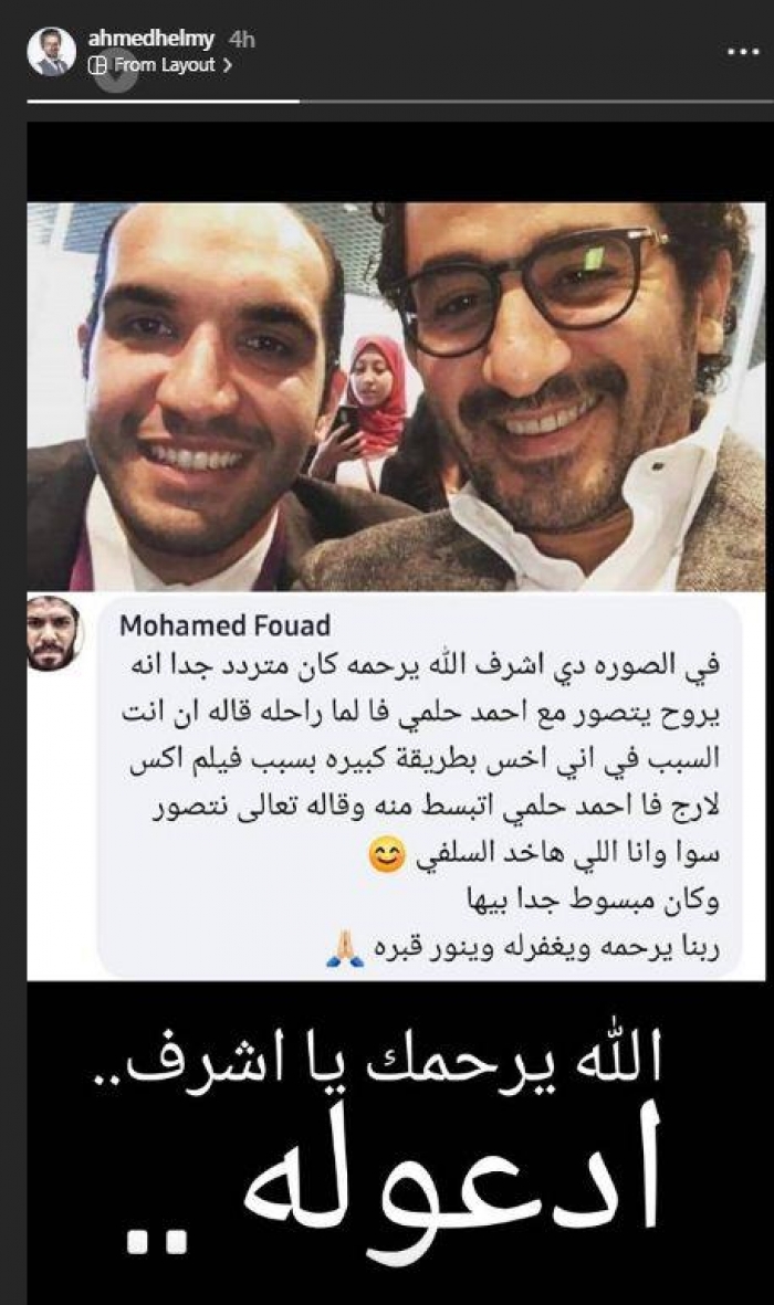 ونشر حلمي، صورة تجمعه معه، قائلاً: "في الصورة دي.. أشرف الله يرحمه كان متردد جدًا إنه يروح يتصور مع أحمد حلمي، فلما راح له قاله إن أنت السبب في إني أخس بطريقة كبيرة بسبب فيلم إكس لارج، فأحمد حلمي اتبسط منه وقاله تعالى نتصور سوا وأنا اللي هاخد السيلفي، وكان مبسوط جدًا بيها، ربنا يرحمه ويغفر له وينور قبره".