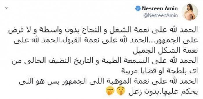 وكتبت نسرين تغريدة، عبر حسابها الرسمي على موقع "تويتر": "الحمد لله على نعمة الشغل والنجاح بدون واسطة ولا فرض على الجمهور.. الحمد لله على نعمة القبول، الحمد لله على نعمة الشكل الجميل، الحمد لله على السمعة الطيبة والتاريخ النضيف الخالي من أي بلطجة أو قضايا مريبة، الحمد لله على نعمة الموهبة اللي الجمهور بس هو اللي يحكم عليها، بدون زعل".