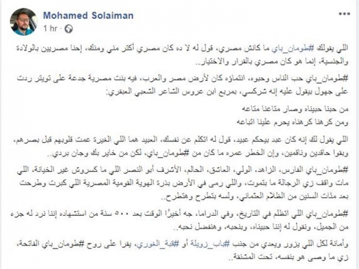 وكتب عبدالمالك: "اللي يقولك طومان باي ما كانش مصري، قوله لا ده كان مصري أكتر مني ومنك، إحنا مصريين بالولادة والجنسية، إنما هو كان مصري بالقرار والاختيار".