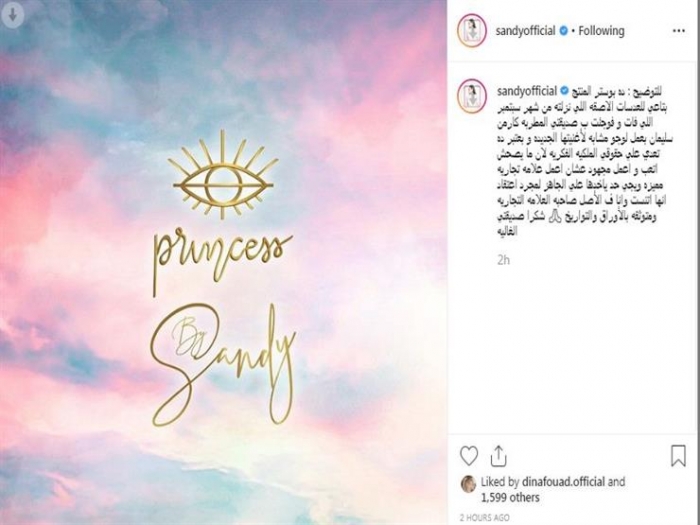 وكتبت ساندي، عبر حسابها على"إنستجرام"، وعلقت: ده بوستر المنتج بتاعي للعدسات اللاصقة اللي نزلته من شهر سبتمبر اللي فات.. وفوجئت بصديقتي المطربة كارمن سليمان بعمل لوجو مشابه لأغنيتها الجديدة، وبعتبر ده تعدي على حقوقي الفكرية".