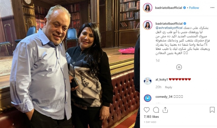 وكتبت بدرية: "بشكرك على دعمك ليا ووقفتك جنبي يا أبو قلب زي الفل، مبروك المنصب الجديد أكيد ده مش من فراغ، حضرتك بتتعب كتير ودماغك مشغولة ٢٤ ساعة وإحنا شفنا ده بعنينا، ربنا يقدرك ويعينك علينا، بكرر شكرى ليك يا طيب فعلا الغربة بتبين المعادن".