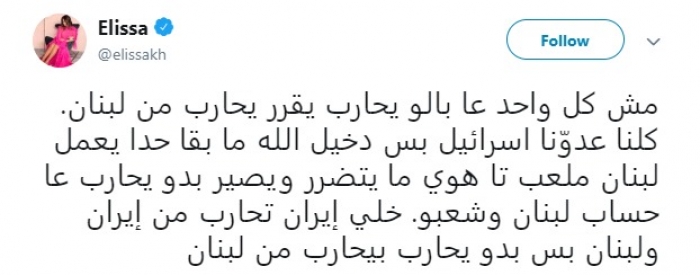 وكتبت إليسا،: " مش كل واحد على باله يحارب يقرر يحارب من لبنان، كلنا عدوّنا إسرائيل بس دخيل الله ما بقا حدا يعمل لبنان ملعب تا هوي ما يتضرر ويصير بدو يحارب عا حساب لبنان وشعبه، خلي إيران تحارب من إيران ولبنان بس بدو يحارب بيحارب من لبنان".