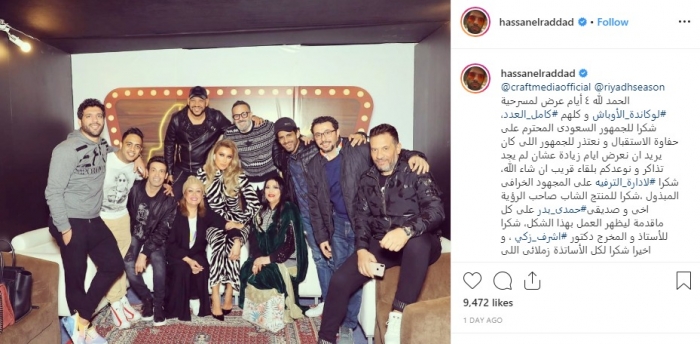وكتب حسن الرداد: "الحمد لله ٤ أيام عرض لمسرحية لوكاندة الأوباش وكلهم كامل العدد، شكرا للجمهور السعودي المحترم على حفاوة الاستقبال ونعتذر للجمهور اللى كان يريد أن نعرض أيام زيادة عشان لم يجد تذاكر ونوعدكم بلقاء قريب إن شاء الله".