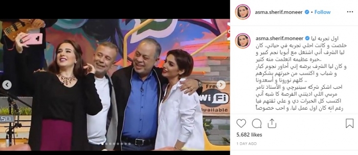 وعلقت أسما على الصور: "أول تجربه ليا خلصت، و كانت أحلى تجربه في حياتي، كان ليا الشرف إني اشتغل مع أبويا نجم كبير وخبرة عظيمة اتعلمت منه كتير، وكان ليا الشرف برضه إني أحاور نجوم كبار وشباب، واكتسب من خبرتهم، بشكرهم كلهم نورونا و أسعدونا".