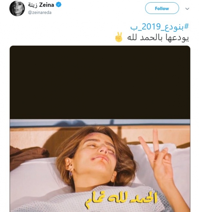 وكتبت قائلة:"بنودع عام 2019 بـ... بودعها بالحمد لله".