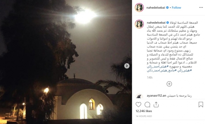 وعلقت ناهد، على الصور قائلة: "الجمعة السادسة لوفاة هيثم، اللهم لك الحمد كما ينبغي لجلال وجهك وعظيم سلطانك تم بحمد الله بناء جامع هيثم أحمد ذكي في الجمعة السادسة نرجو الدعاء لهيثم وأمواتنا والأموات جميعًا".