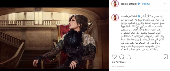 ونشرت أصالة صورة لها عبر حسابها الرسمي على موقع "إنستجرام"، معلقة "يُسعدني جدّاً أنّ أُغنّي لأوّل مرّة في مكان لا حدود له، البرد فيه لم يمنع القلوب الطيّبة والأرواح الحالمة منّ أنّ تقصده، دفاه سيكون منّ تآلف أحبّة يروا في الحياة ما يُغري لأنّ تُعاش، وسنكون أقرب لنسمع ونعيش كلّ خبايا الشّعور".