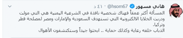 أكد المحلل السياسي هاني مسهور، اليوم السبت، أن شخصية نافذة في حكومة الشرعية هي التي تمول وتدرب الخلايا الإلكترونية التي تستهدف السعودية والإمارات ومصر.