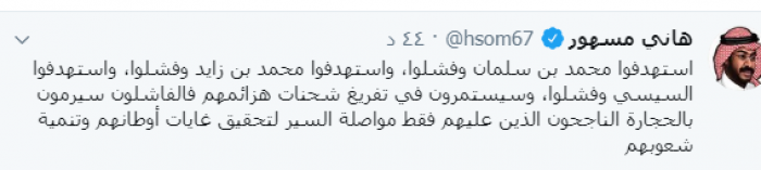 وكتب مسهور عبر "تويتر":"استهدفوا محمد بن سلمان وفشلوا، واستهدفوا محمد بن زايد وفشلوا، واستهدفوا السيسي وفشلوا، وسيستمرون في تفريغ شحنات هزائمهم فالفاشلون سيرمون بالحجارة الناجحون الذين عليهم فقط مواصلة السير لتحقيق غايات أوطانهم وتنمية شعوبهم".