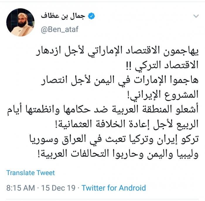 وكتب بن عطاف، في تغريدة له عبر موقع التواصل الاجتماعي تويتر، تابعها المشهد العربي: "يهاجمون الاقتصاد الإماراتي لأجل ازدهار الاقتصاد التركي، وهاجموا الإمارات في اليمن لأجل انتصار المشروع الإيراني".